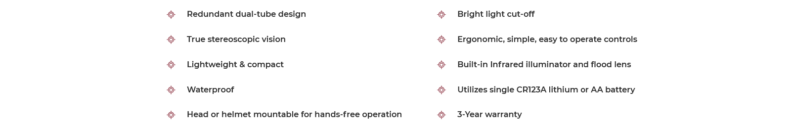 AGM NVG-40 3AW1 (phosphore blanc) – lunette de vision nocturne à double tube L3 Gen 3 P45 (phosphore blanc) 18mm, pour un FOM moyen de 1700 (S/N – dB : 28 x Résolution – central / latéral : 64/72l/mm) – fonctionne avec 1 batterie AA (1,5 V) ou une CR123A (3V / lithium), pour une autonomie jusqu’à 20 heures. Coupure automatique en cas d’exposition à une luminosité trop vive & fonction activation/désactivation si le NVG-40 3AW1 est monté sur casque – son illuminateur infrarouge intégré permet à l’utilisateur d’opérer dans l’obscurité totale. Particulièrement adapté à la conduite en condition dégradées ou en zone de combat.