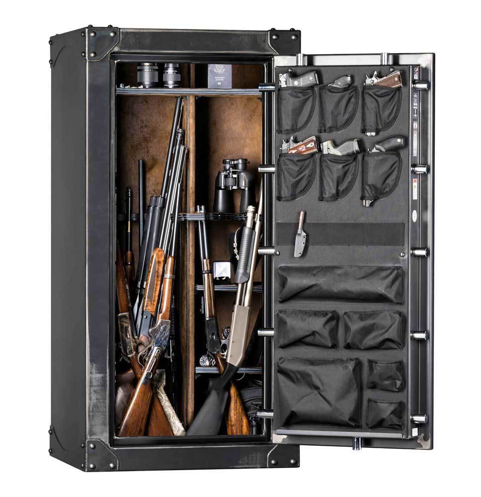 Coffre-fort pour armes (35 armes longues et 6 armes de poing), de style “1800” apporte un style intemporel, usiné & patiné à la main pour accentuer les variations naturelles du métal – chaque modèle est unique. Fabrication en acier “heavy duty” 12 gauge – corps et porte (2,77mm d’épaisseur et densité de 22,2Kg au m2). Coupe-feu 85 minutes (1400F°/760C°), doublement du corps aux angles par renfort externe, porte doublée sur son pourtour (sur toute la surface qui pourrait servir de point de levier). Verrouillage de la porte par 13 points (1″-2,54cm de diamètre, positionnement sur tout le pourtour de la porte), serrurerie Sargent and Greenleaf (mécanique ou électronique au choix) protégée par une plaque acier avec ses roulements à bille, molette d’embrayage du mécanisme anti-sabotage breveté F-4 – plaque de protection en carbure de tungstène & boitier de mécanisme blindé contre le perçage et le poinçonnage. Coffre et serrure normalisés & validés UL – classifié comme coffre pour zone résidentielle (USA & Canada) avec correspondance de normalisation CNNP (France) et DAkkS (Allemagne). Ensemble normalisé selon les regles du DOJ (Department of Justice) de l’etat de Californie quand à la sécurisation des armes à feu.