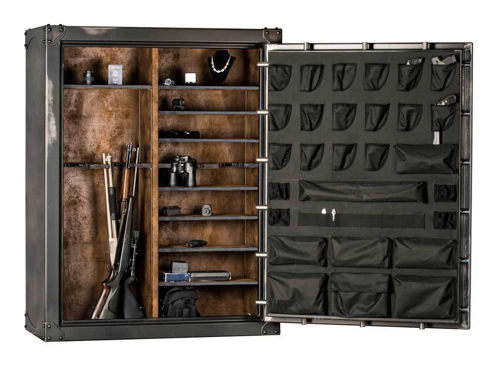 Coffre-fort pour armes (76 armes longues et 16 armes de poing), de style “1800” apporte un style intemporel, usiné & patiné à la main pour accentuer les variations naturelles du métal – chaque modèle est unique. Fabrication en acier “heavy duty” 12 gauge – corps et porte (2,77mm d’épaisseur et densité de 22,2Kg au m2). Coupe-feu 85 minutes (1400F°/760C°), doublement du corps aux angles par renfort externe, porte doublée sur son pourtour (sur toute la surface qui pourrait servir de point de levier). Verrouillage de la porte par 18 points (1″-2,54cm de diamètre, positionnement sur tout le pourtour de la porte), serrurerie Sargent and Greenleaf (mécanique ou électronique au choix) protégée par une plaque acier avec ses roulements à bille, molette d’embrayage du mécanisme anti-sabotage breveté F-4 – plaque de protection en carbure de tungstène & boitier de mécanisme blindé contre le perçage et le poinçonnage. Coffre et serrure normalisés & validés UL – classifié comme coffre pour zone résidentielle (USA & Canada) avec correspondance de normalisation CNNP (France) et DAkkS (Allemagne). Ensemble normalisé selon les regles du DOJ (Department of Justice) de l’etat de Californie quand à la sécurisation des armes à feu.