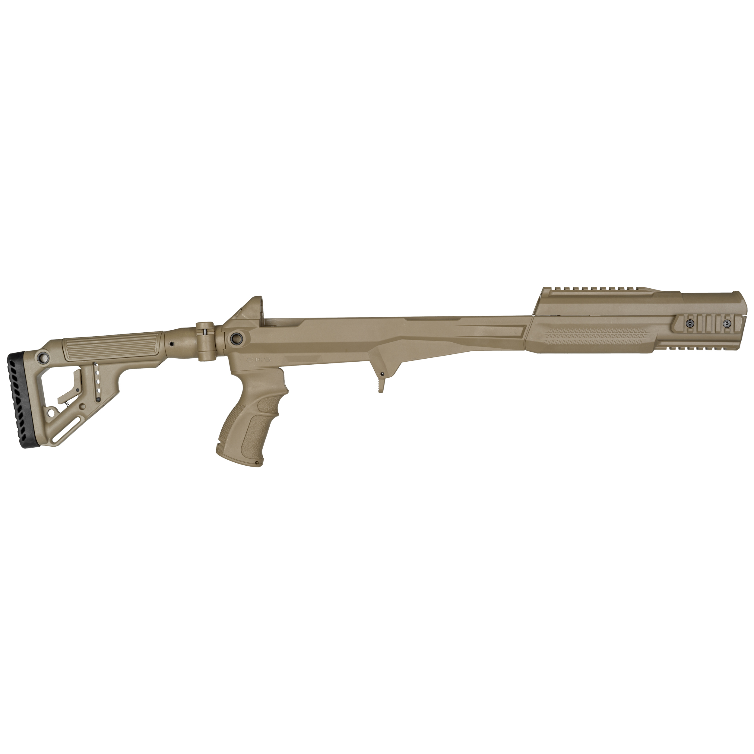 Fab Defense SKS UAS, pour tous les modèles de carabines SKS Russes, Chinoises & Yougoslaves, fourni avec sa crosse Tactique UAS FAB DEFENSE – une conception spécifique pour une crosse ergonomique et fine, avec son appuie-joue réglable en hauteur, son corps réglable en longueur sur 5 positions et sa poignée pistolet texturée (compartiment dans le corps de la poignée pour l’emport d’une batterie de secours ou d’une burette d’huile). Construction Polymère et fibre de verre, conçue pour accepter les magasins Pro-Mag et TAPCO, 4 rails picatinny (à 360°) pour montage scout – ajout d’un bipied, d’un point rouge ou d’un désignateur laser. Conception ergonomique, prise en main sure et précise.