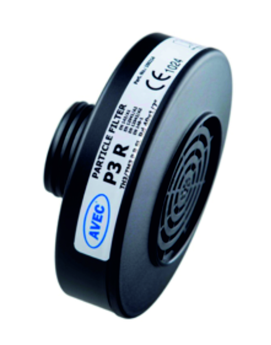 Filtre à particules AVEC-CHEM P3 R, conçu pour les risques biologiques, le filtre à particules P3 R – à utiliser sur un masque à gaz ou un respirateur motorisé – assure la filtration des bactéries, virus, germes, spores, particules dangereuses et amiante.