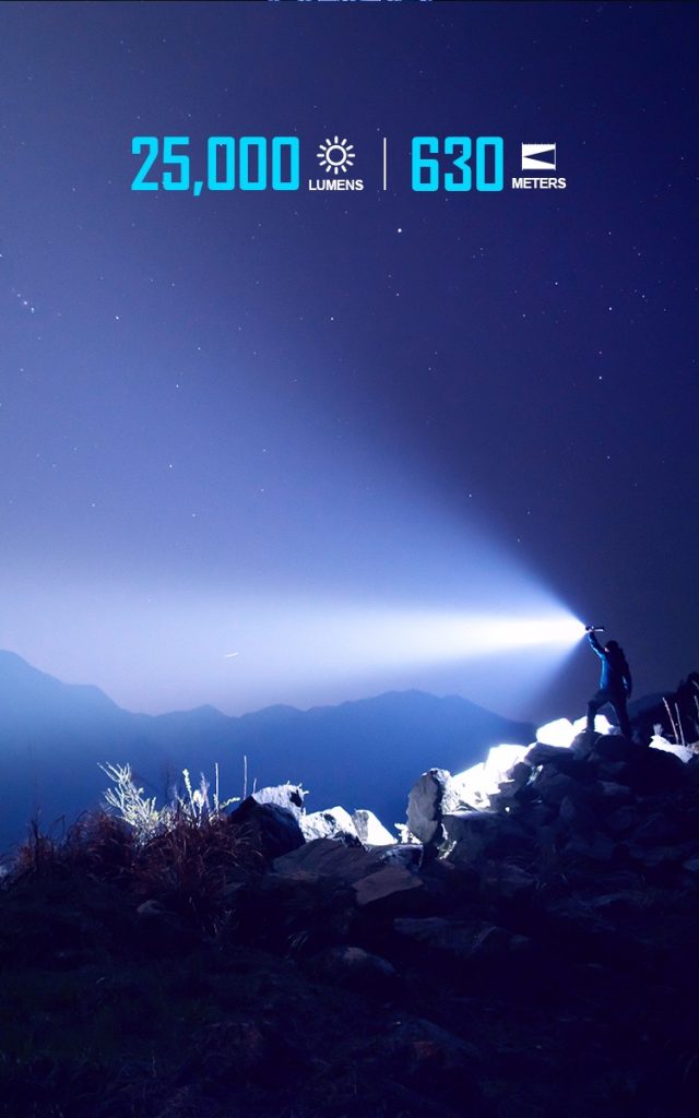 Puissance de 25000 Lumens (99200 candela) – portée pratique de 630 mètres – 1 mode stroboscopique