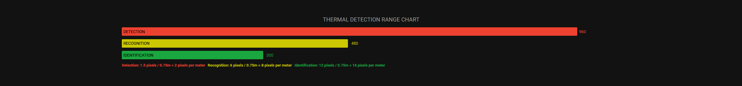 - Détection humaine: 950m / Reconnaissance humaine: 480 m / Identification humaine: 300 m