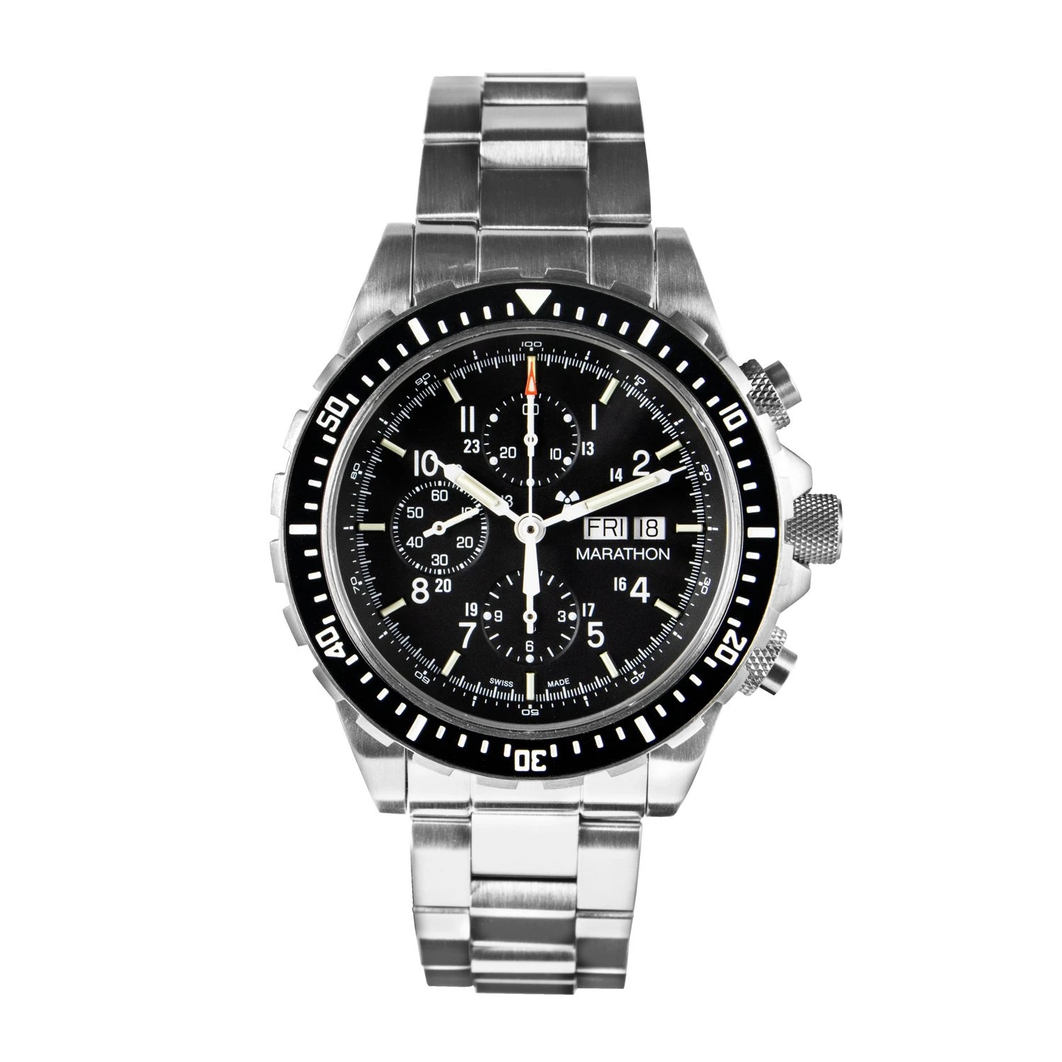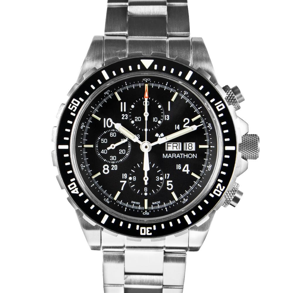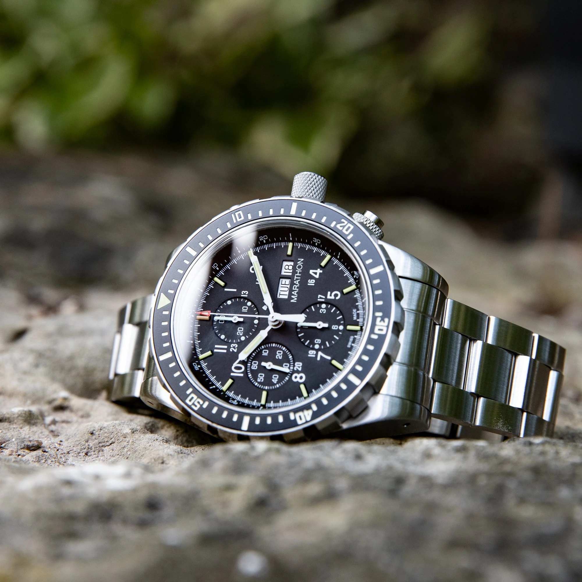 Marathon CSAR Chronograph Automatic (46mm) – Chronograph Search and Rescue de Marathon, polyvalent et dédié aux soldats, fabriquée selon le cahier des charges de l’armée US – validée MIL-SPEC. Fabrication à La Chaux de Fonds (Suisse), selon la norme ISO 6425, corps en acier chirurgical 316L, verre Saphir anti-rayure – lisibilité maximale du cadran – et garantie étanche jusqu’à 300 mètres (1000 feet) !
