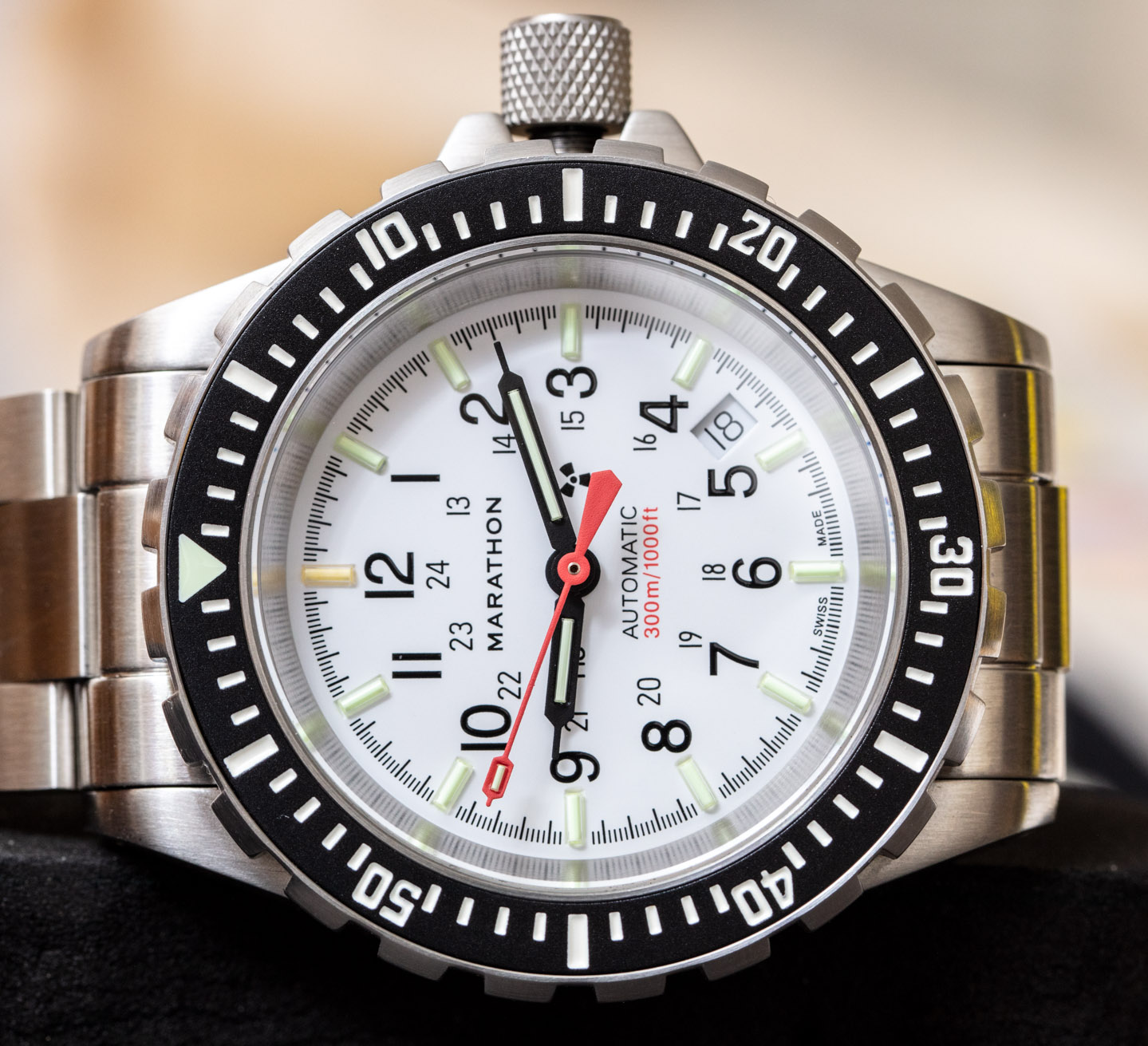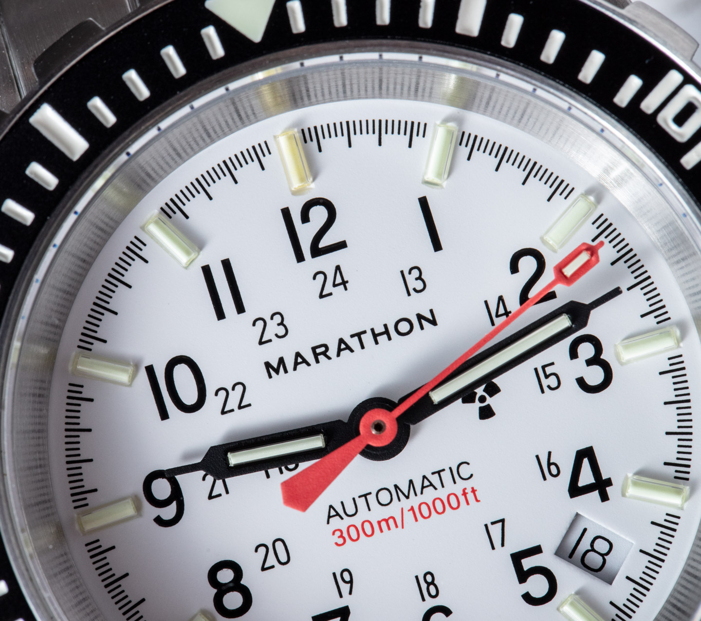 Marathon GSAR Arctic Automatic (41mm) – Montre Marathon GSAR, dans sa version Arctic (boitier 41mm) et son cadre à fond blanc ! Fabriquée selon le cahier des charges de l’armée US – validée MIL-SPEC. Fabrication à La Chaux de Fonds (Suisse), selon la norme ISO 6425, corps en acier chirurgical 316L, verre Saphir anti-rayure – lisibilité maximale du cadran – et garantie étanche jusqu’à 300 mètres (1000 feet) !