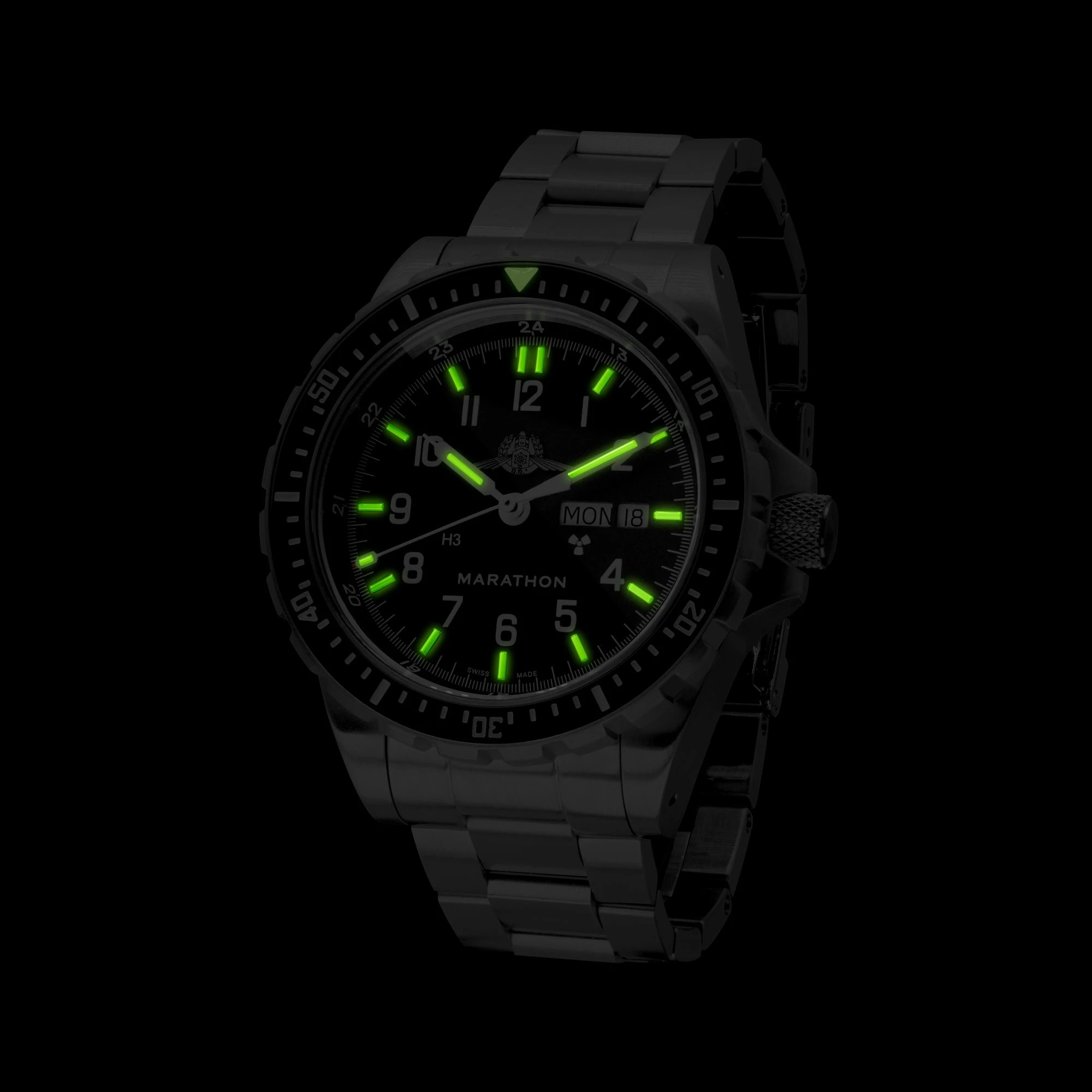 Marathon JDD Automatic (46mm) YAMAM – Montre Marathon Jumbo Diver’s JDD “Jumbo Day & Date” YAMAM, dédiée aux situations extrêmes avec affichage bilingue Anglais/Hébreu, fabriquée selon le cahier des charges de l’armée israélienne ! Fabrication à La Chaux de Fonds (Suisse), corps en acier chirurgical 316L, verre Saphir anti-rayure – légèrement bombé pour une lisibilité maximale du cadran & bracelet acier 22mm à finition brossée – montre garantie étanche jusqu’à 300 mètres (1000 feet).