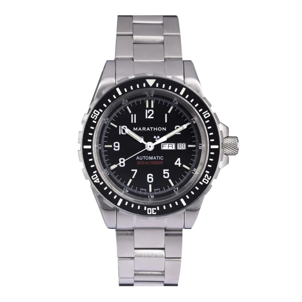 Marathon JDD Automatic (46mm) – Montre Marathon Jumbo Diver’s JDD “Jumbo Day & Date”, dédiée aux situations extrêmes avec affichage bilingue Anglais/Français, fabriquée selon le cahier des charges de l’armée israélienne ! Fabrication à La Chaux de Fonds (Suisse), corps en acier chirurgical 316L, verre Saphir anti-rayure – légèrement bombé pour une lisibilité maximale du cadran & bracelet acier 22mm à finition brossée – montre garantie étanche jusqu’à 300 mètres (1000 feet), validé NSN : 6645-01-697-8862.