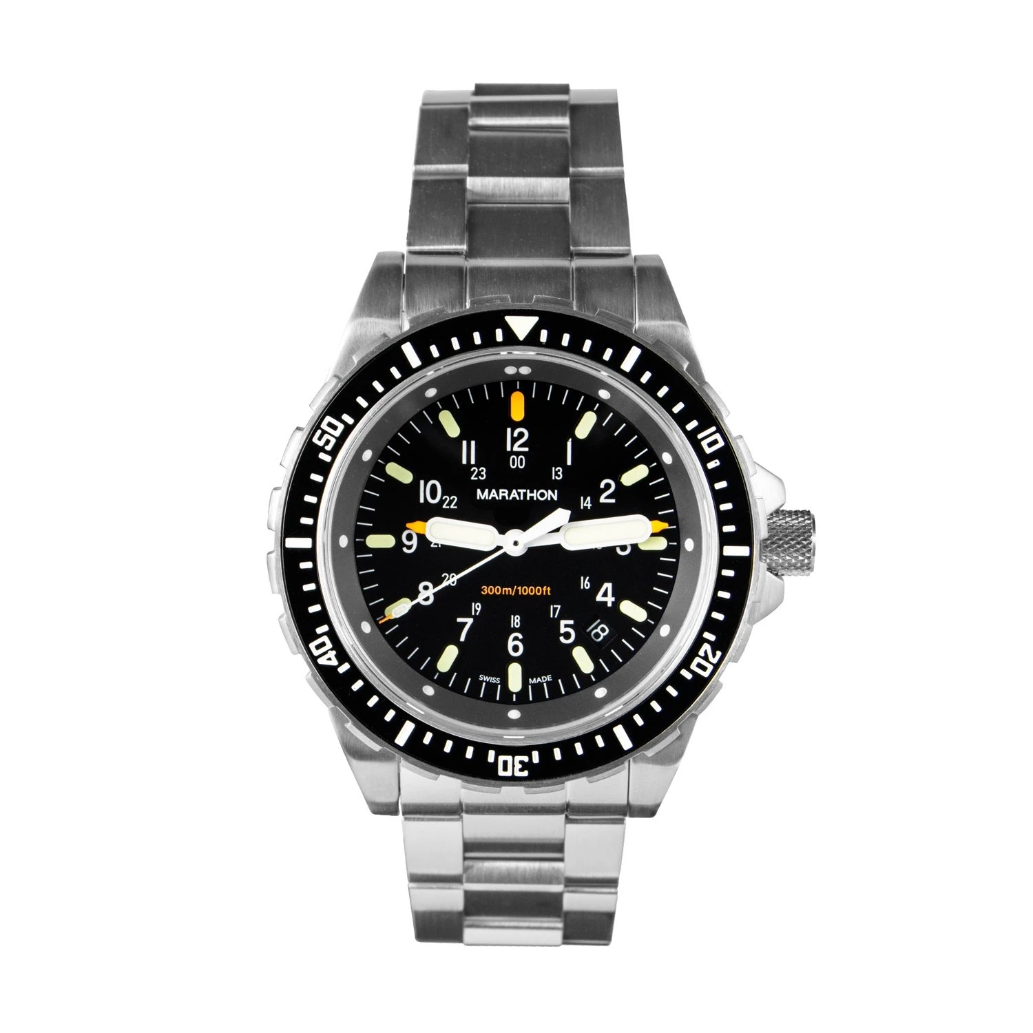 Marathon JSAR Quartz (46mm) bracelet acier – Montre Marathon JSAR – Jumbo Search & Rescue – avec boitier 46mm, dédiée aux plongeurs SAR et aux professionnels de l’urgence, fabriquée selon le cahier des charges de l’armée US – validée MIL-SPEC. Fabrication à La Chaux de Fonds (Suisse), selon la norme ISO 6425, corps en acier chirurgical 316L, verre Saphir anti-rayure – légèrement bombé pour une lisibilité maximale du cadran & bracelet acier 22mm à finition brossée – montre garantie étanche jusqu’à 300 mètres (1000 feet).