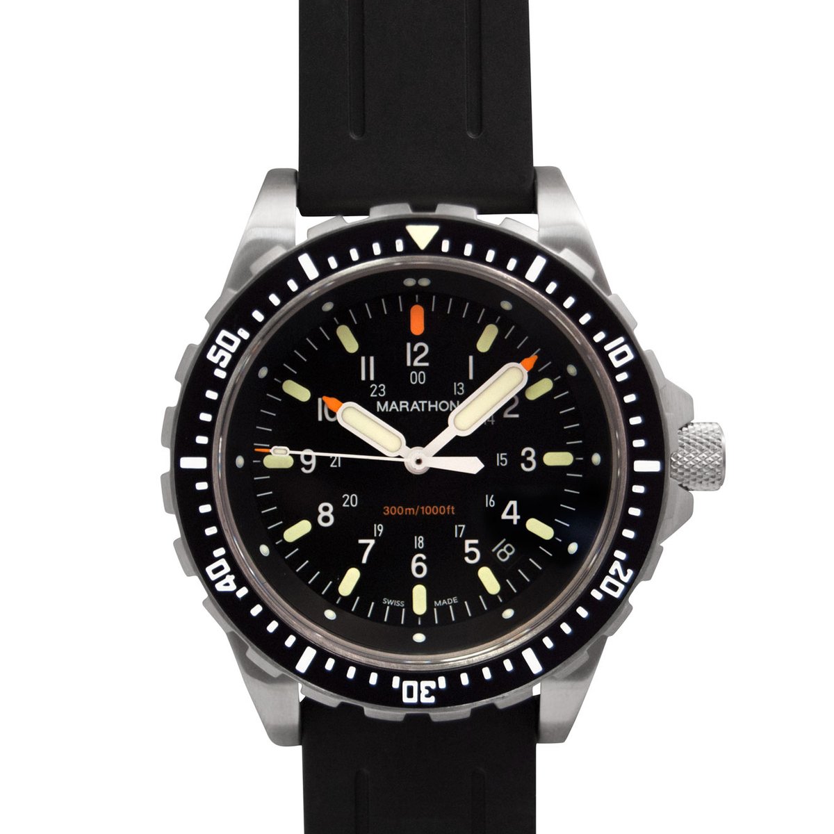 Marathon JSAR Quartz (46mm) bracelet caoutchouc noir – Montre Marathon JSAR – Jumbo Search & Rescue – avec boitier 46mm, dédiée aux plongeurs SAR et aux professionnels de l’urgence, fabriquée selon le cahier des charges de l’armée US – validée MIL-SPEC. Fabrication à La Chaux de Fonds (Suisse), selon la norme ISO 6425, corps en acier chirurgical 316L, verre Saphir anti-rayure – légèrement bombé pour une lisibilité maximale du cadran & bracelet caoutchouc 22mm – caoutchouc vulcanisé selon le cahier des charges de l’US Army, boucle en acier 316L – montre garantie étanche jusqu’à 300 mètres (1000 feet).