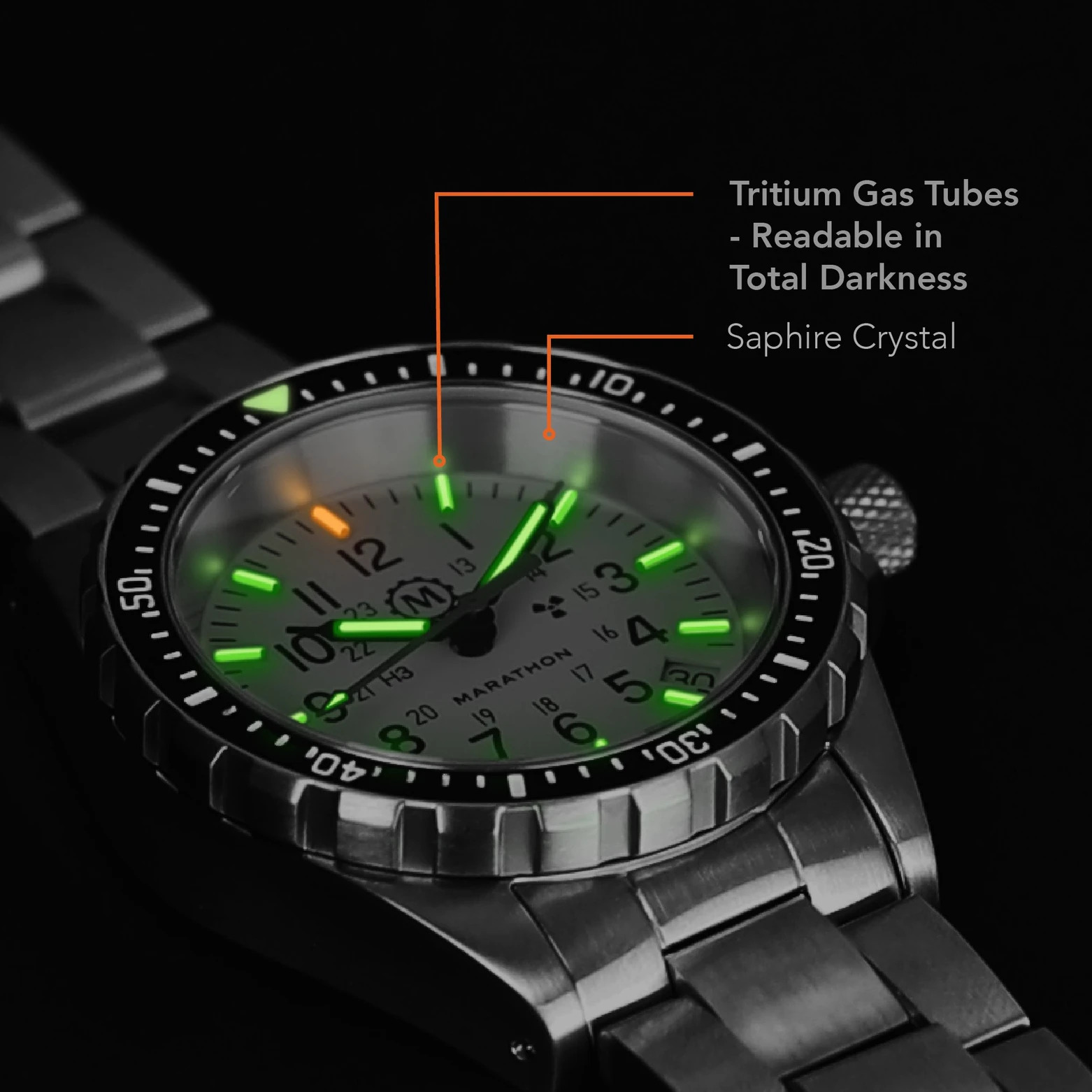 Plus compacte que les modèles Marathon classiques, conçue pour les opérateurs de secours, le soldat déployé en opération ou le plongeur SAR, vous assure une discrétion optimale (pas de reflet sur le boitier), robustesse exceptionnelle, fiabilité dans des conditions extrêmes et une lecture de cadran optimale dans des conditions de visibilité basses.