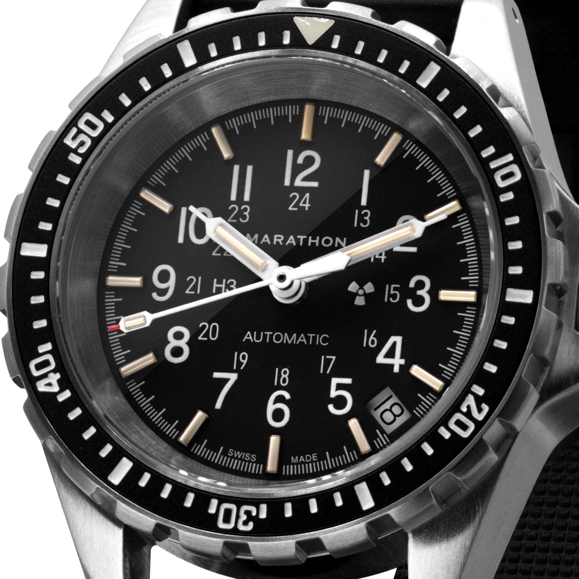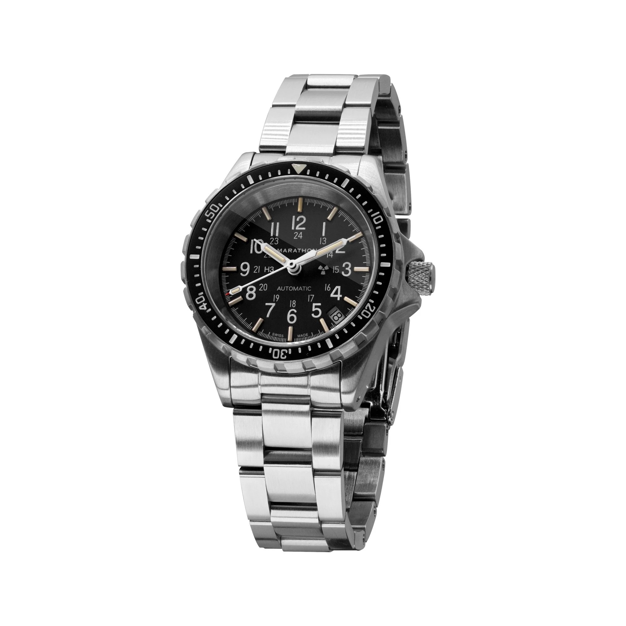 Marathon MSAR Automatic (36mm) – La montre de plongée de Marathon compacte (boitier 36mm), dédiée aux poignets moyens et fins ! Fabriquée selon le cahier des charges de l’armée US – validée MIL-SPEC. Fabrication à La Chaux de Fonds (Suisse), selon la norme ISO 6425, corps en acier chirurgical 316L à finition brossée, verre Saphir anti-rayure – lisibilité maximale du cadran – et garantie étanche jusqu’à 300 mètres (1000 feet) !