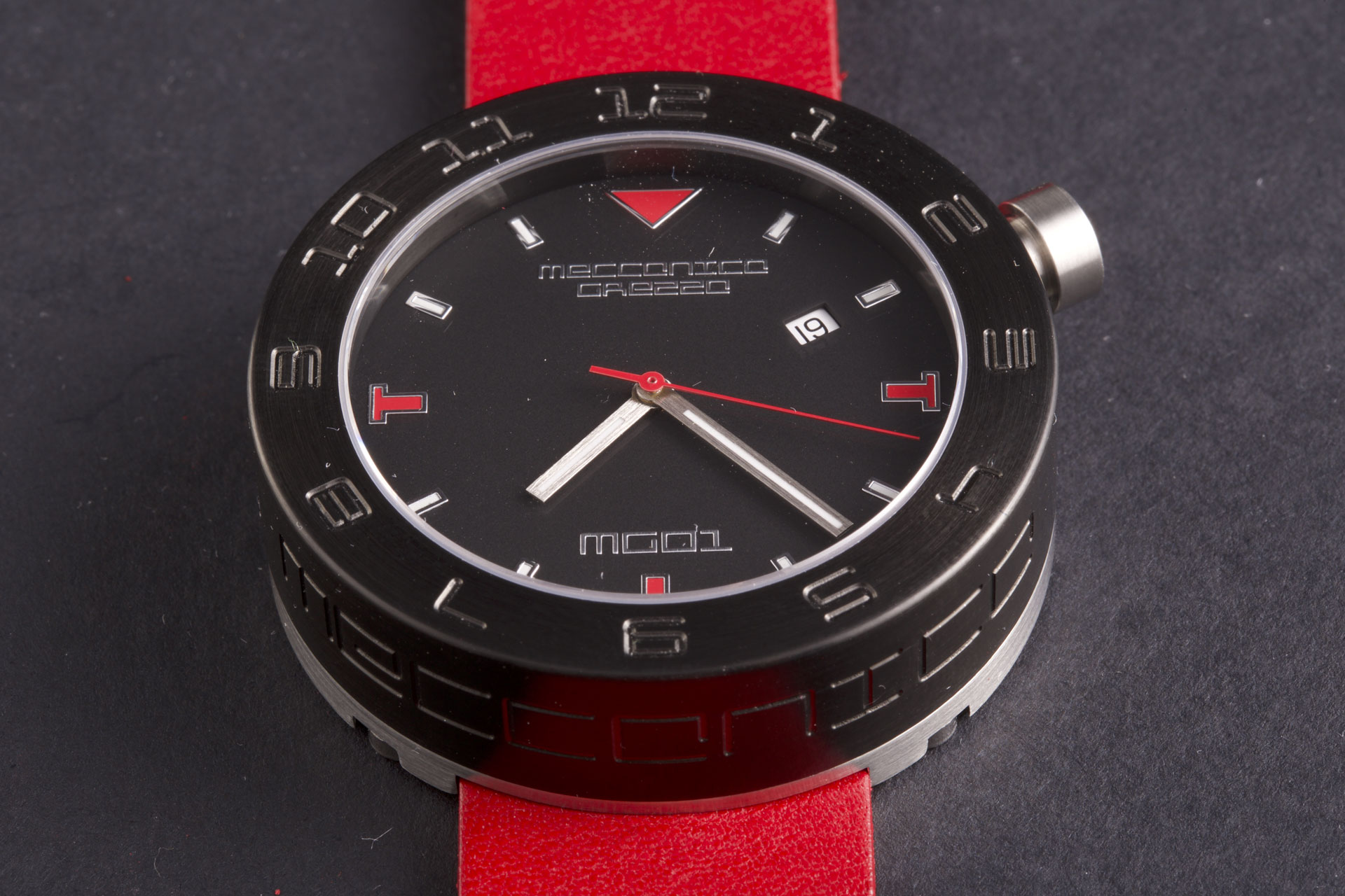 Montre Automatique MECCANICA GREZZA MG01 44B BK/RD, un modèle aux lignes pures & intemporelles, crée par le patron de la marque, dans un esprit de simplicité, pour un usage au quotidien, lisibilité exceptionnelle du cadran. Boitier cylindrique, fond & visserie en acier AISI 316L usinés dans la masse avec gravures par fraisage, finition brossé NOIR (PVD – Physical Vapor Deposition treatment), pour un diamètre de 44mm et une épaisseur de 13,75mm – fond d’une épaisseur de 6,5mm (butée “bride”, montée sur joint torique & verrouillage par vis ALLEN).