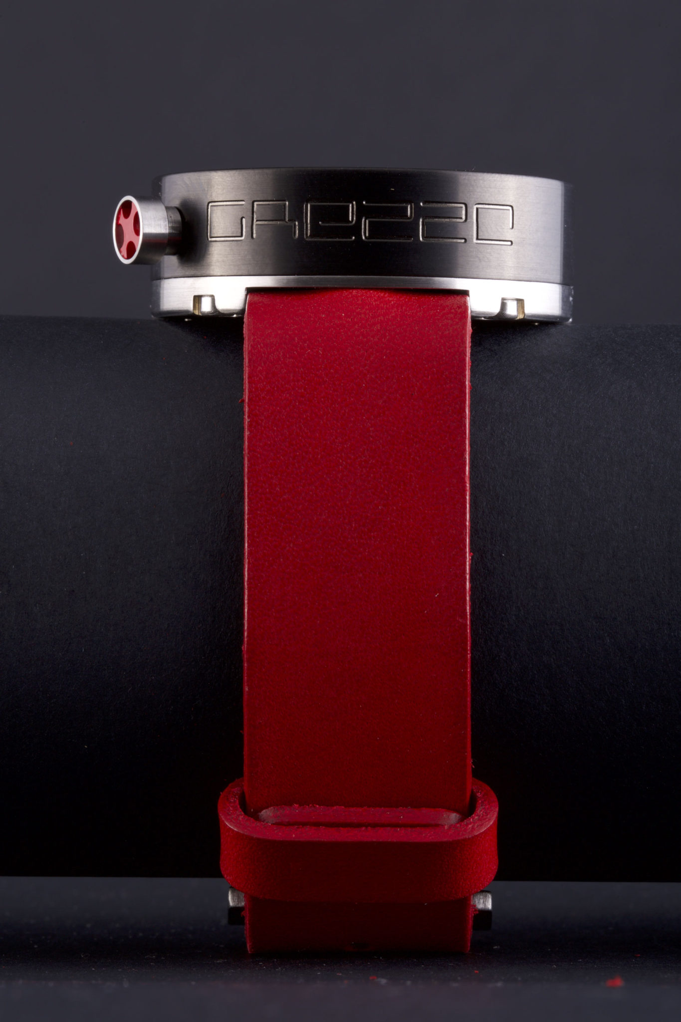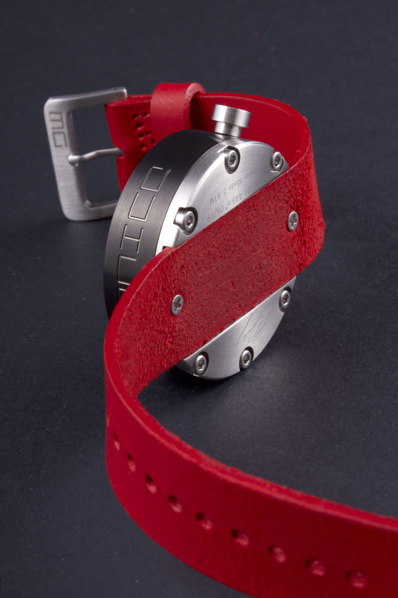 Verre saphir, résistance exceptionnelle à la rayure et passage optimal de la lumière – Fond acier AISI 316L, (diamètre 44 mm & épaisseur de 6,5 mm), usiné dans la masse avec butée « bride » et joint torique d’étanchéité, finition identique à celle du boitier – marquage Swiss Made sur cadran et fond du boîtier gravé avec l’autographe du fabricant et son numéro de série. Bracelet cuir de vachette (épaisseur de 2,5 mm) teint dans des tons ROUGE selon l’ancienne méthode florentine, travaillé à la main, cousu avec du fil ciré selon la tradition des selliers.