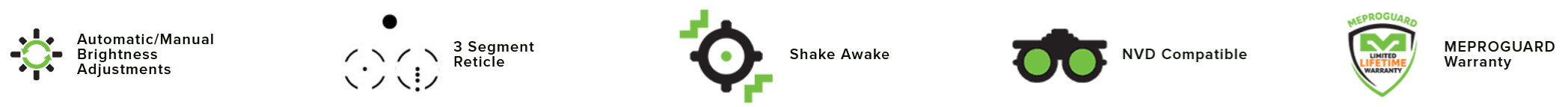 03 réticules au choix (Point rouge central 02 MOA / point rouge central 02 MOA dans un cercle 68 MOA / 04 points en abscisse dans un cercle 68 MOA), illumination LED ROUGE – ajustement de 0,5 MOA par clic – coupure automatique de l’illumination pour préserver la batterie après 60 minutes sans mouvements & capteur intégré ‘shake awake’ pour illumination automatique des que l’arme bouge. Boitier & coque externe en aluminium renforcé validé IP67 – compact et très léger (151.3 grammes).
