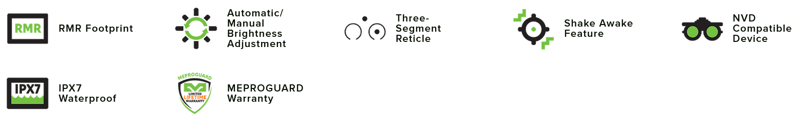 Disponible avec trois réticules sélectionnables – un point 3 MOA, un bulleye (1 point central de 3 MOA, un cercle de 33 MOA et 1 point central de 3 MOA), ou le cercle 33 MOA seul, illumination ROUGE, – ajustement de 1 MOA par clic – coupure automatique de l’illumination pour préserver la batterie, via un capteur de mouvement, revêtement anti reflet sur la surface externe du verre, écran de 0.95”x 0.7” – montage rapide RMR – compact, léger & totalement étanche, indicateur de batterie faible intégré.